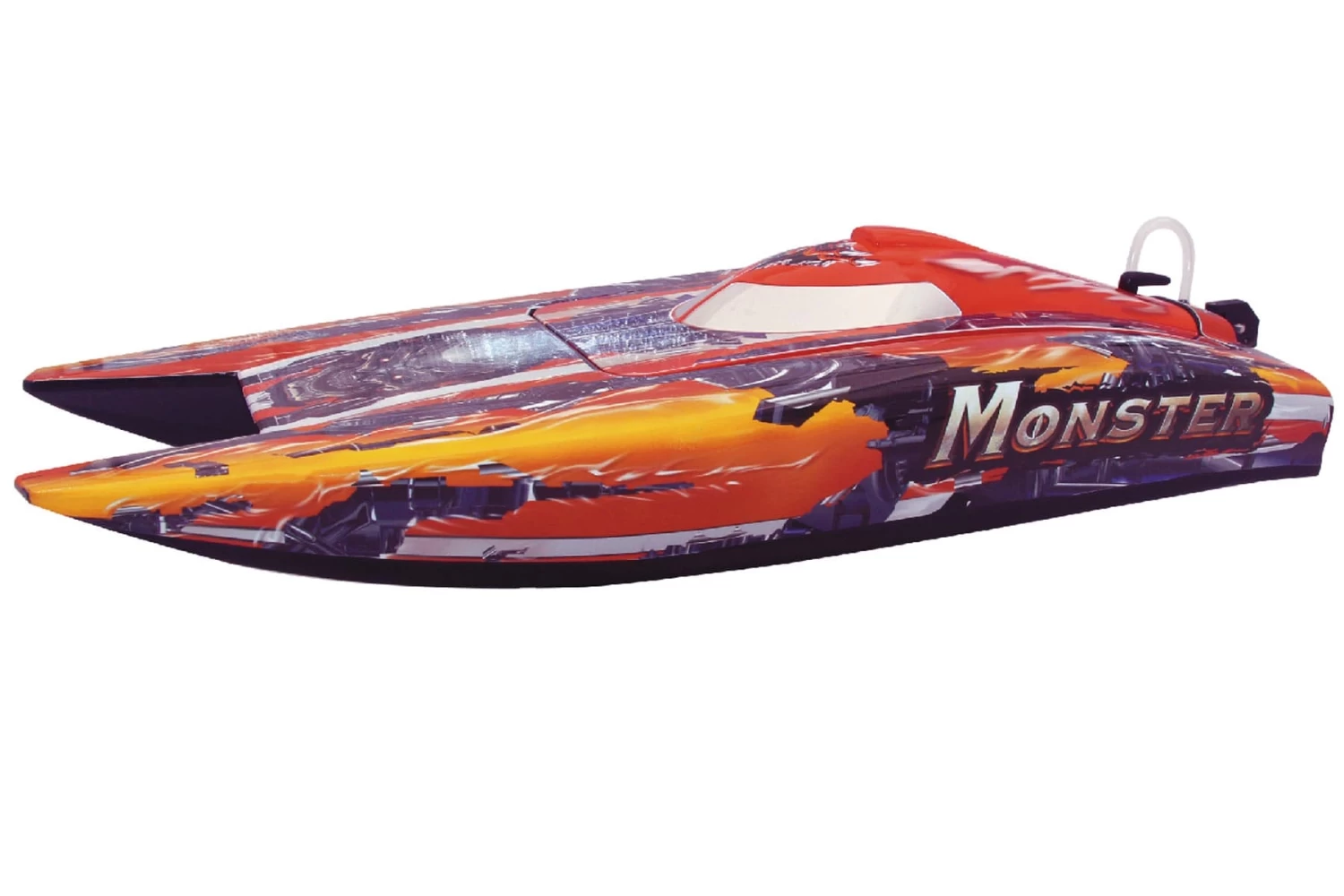 Display this racing boat on your mantle or enjoy it on the water with this functional RTR (Ready to Run) model. Delivered Ready to Run (RTR), the Monster can be operating within minutes of opening the box, using the included 2.4Ghz radio transmitter, 3S battery, and battery charger.
