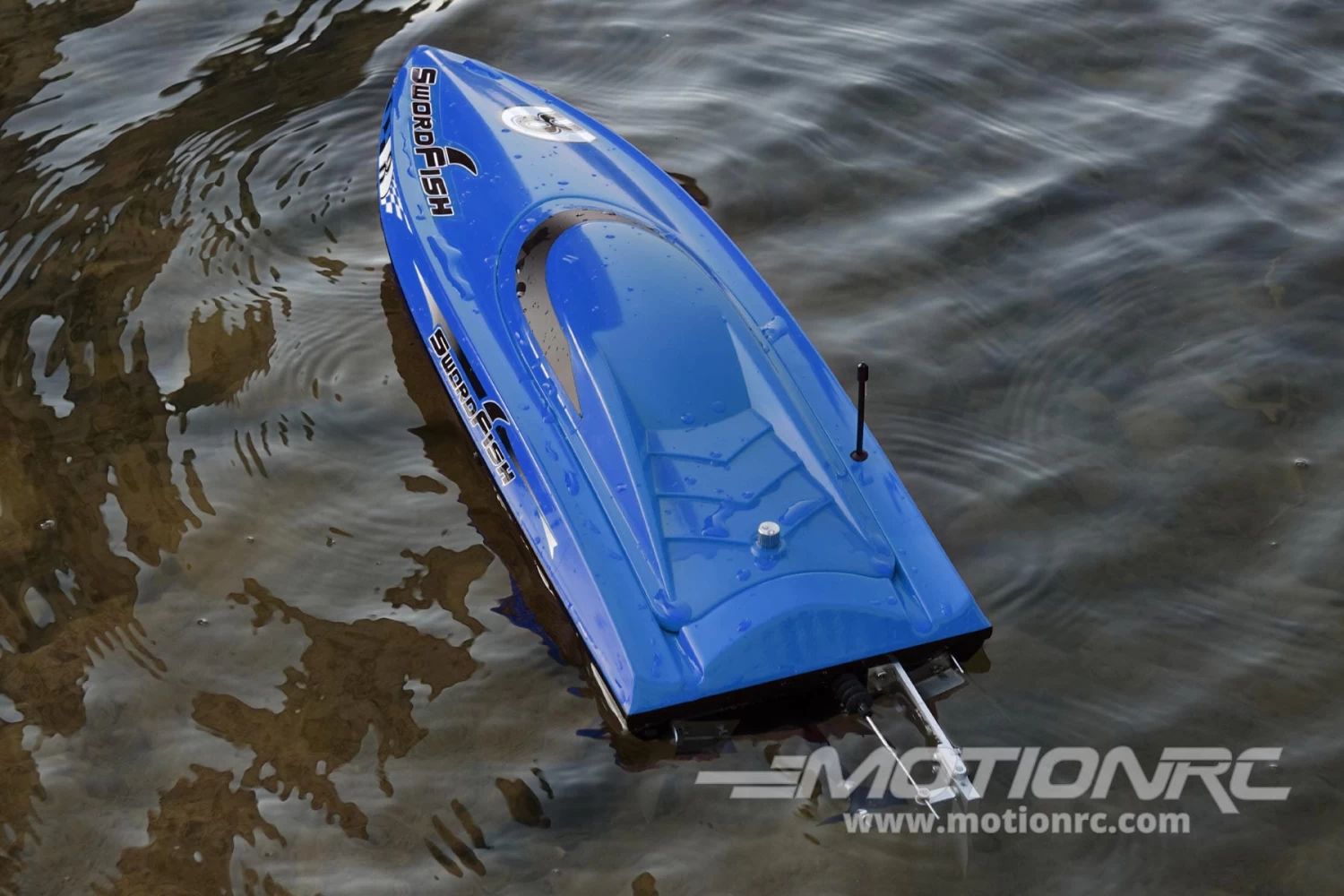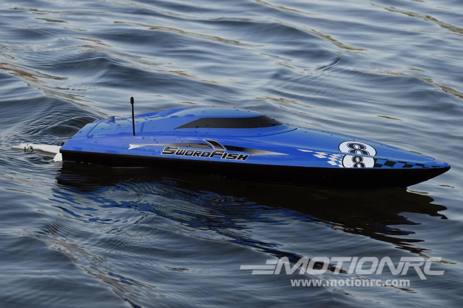 Display this racing boat on your mantle or enjoy it on the water with this functional RTR (Ready to Run) model. Delivered Ready to Run (RTR), the Swordfish can be operating within minutes of arrival, using the included 2.4Ghz radio transmitter and 3S Li-Ion battery. Only four AA batteries and minimal assembly is required.