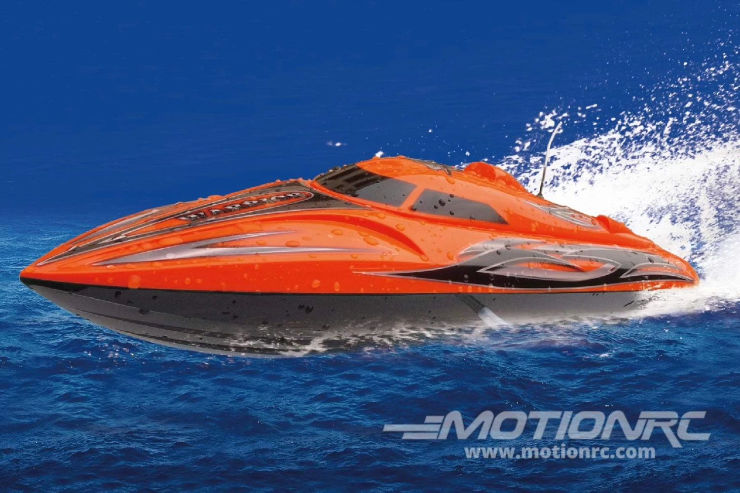 The Bancroft Warrior V3 offers the speed, handling, and stability that only an offshore Deep-V hull design can deliver in a convenient, Ready To Run (RTR) package. Open the box, charge the included battery with the provided charger and toss the boat into the water! All of the electronics are pre-installed, and the boat’s running gear is setup for balanced speed and maneuverability out of the box without any additional adjustment. The Bancroft Warrior V3 sports an attractive, hi-visibility trim scheme that accentuates its speed and performance potential.