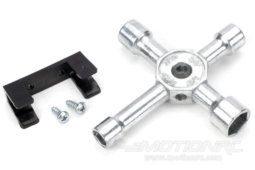 The Du-Bro 4-Way Socket Wrench offers modelers a quality socket wrench at an affordable price. Available in two sizes (Standard and XL) the wrench will accommodate both American and Metric sizes (5/16, 3/8, 7/16, 1/2, 8mm, 10mm, 11mm, 12mm). Also features 3 built in glo-plug holders and special retaining clip. Storage clip mounts securely to field box keeping 4-way wrench readily accessible. Comes complete with mounting screws for storage clip. 1 wrench and clip per package.