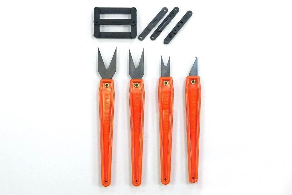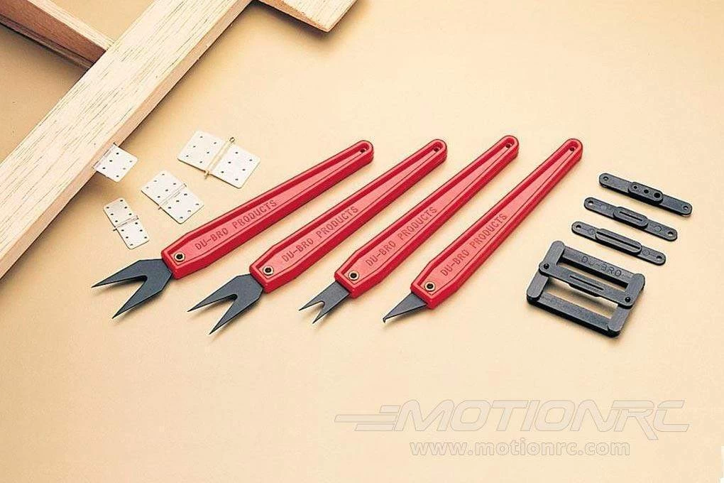 The Du-Bro Hinge Slotter Kit takes the hassle out of slotting control surfaces for gluing hinges. The centering/parallel guide centerd hinge slotter on up to 3/4″ material. Four handle set plus guide and centering tool for three different size slotting forks: mini, standard and heavy duty hinges. Designed to work with all Du-Bro hinges. The 3 slotters and the “picker” are permanently mounted to red nylon handles. Packaged in reusable, recyclable clamshell storage blister.