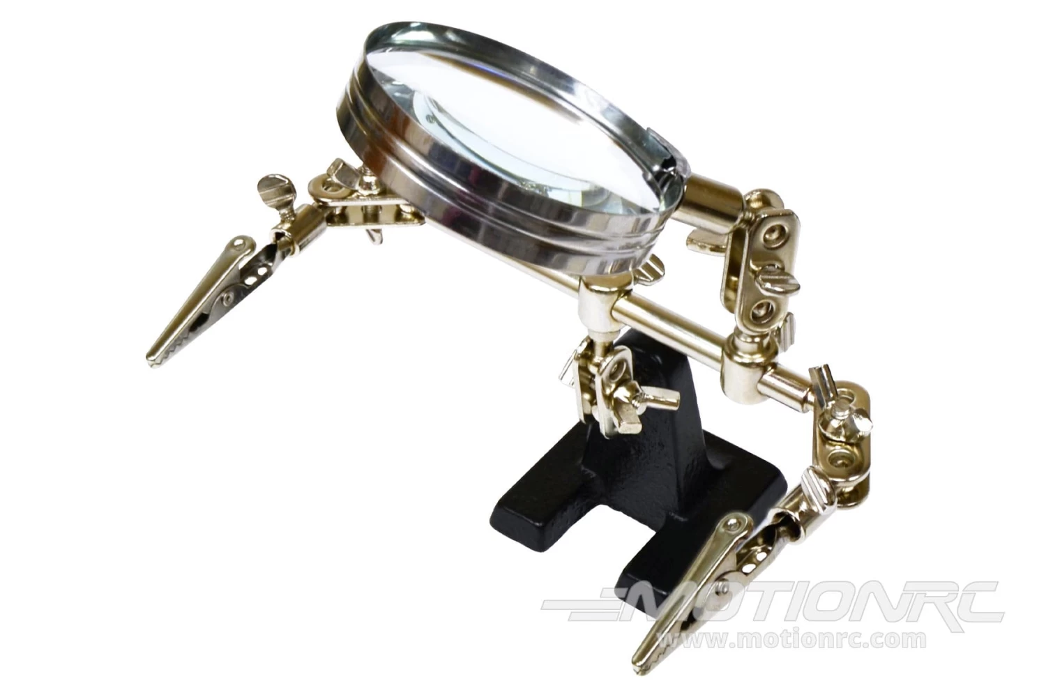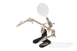 The Helping Hands with Magnifying Glass can be used for soldering or making fine adjustments. Adjustable arms can hold objects in any position. 060mm lens.