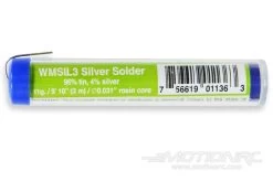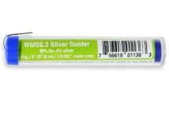 Elenco’s Silver solder has a rosin core, .031″ diameter, is 96% tin & 4% silver, is 3 meters in length, and weighs 11 grams.