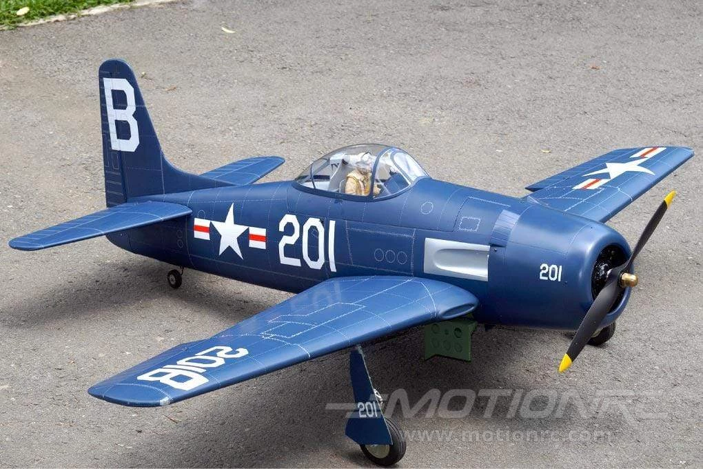 The Nexa F8F Bearcat is a 33cc size electric or gas option scale series warbird with a 2020mm wingspan, constructed primarily from balsa wood and covered with a fuel-resistant covering. This ARF requires assembly and installation of your choice of servos and power system, and includes electric retracts and struts, two piece wing with aluminum wing joiner, flaps, operational gear doors, painted pilot and pre-hinged and installed control surfaces. The large battery hatch affords ample room for either electric or gas setups. An absolute classic at any airfield.
