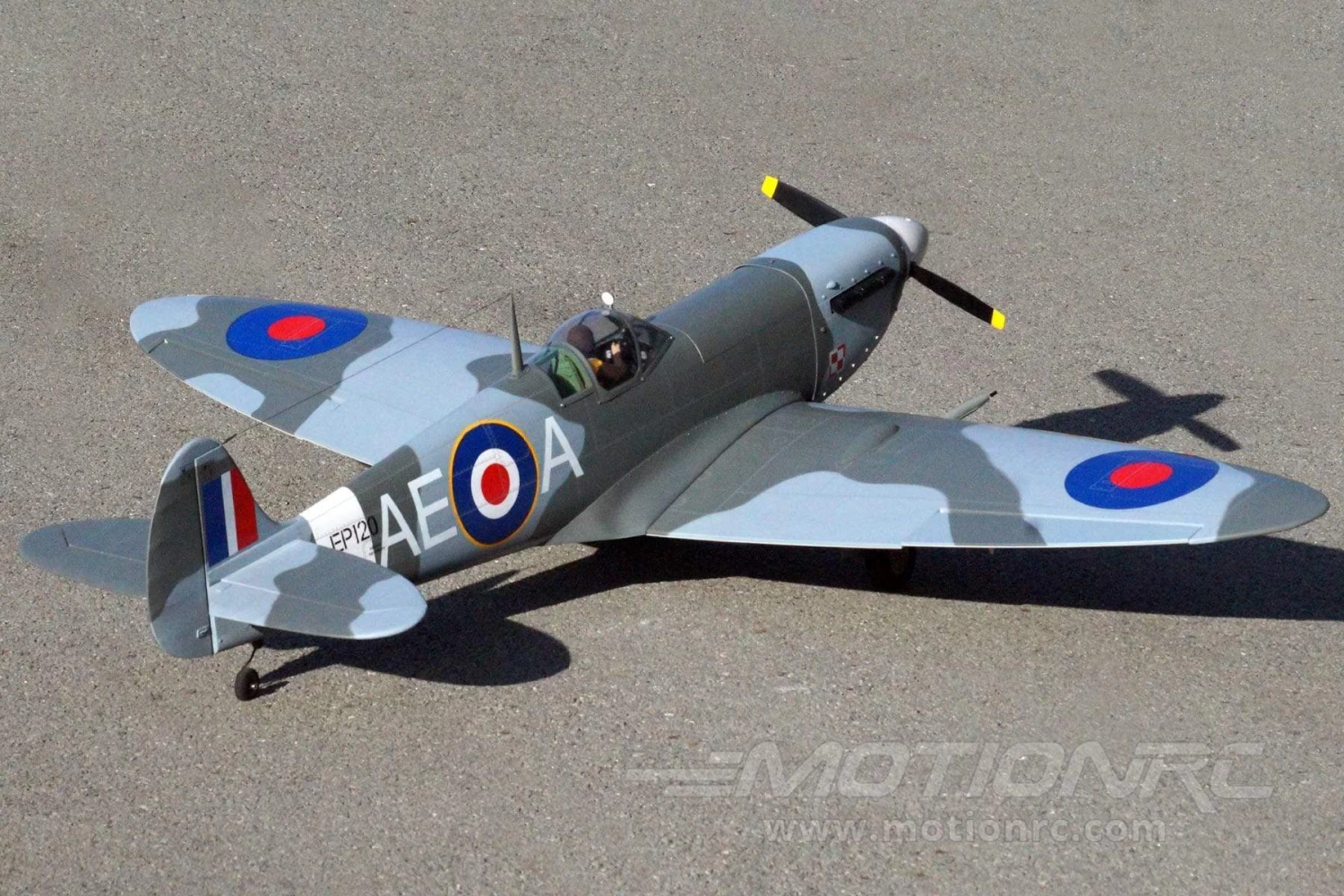 The Nexa Spitfire Mk.IX is a .50 size electric or gas option scale series warbird with a 1540mm wingspan, constructed primarily from balsa wood and covered with a fuel-resistant covering. This ARF requires assembly and installation of your choice of servos and power system, and includes split flaps, painted pilot, machine gun, antenna and other scale details. The large battery hatch affords ample room for either electric or gas setups. To complete the scale appeal of this beautiful Spitfire, the model includes electric retracts and scale struts. Impress at your flying field with this iconic stunner!