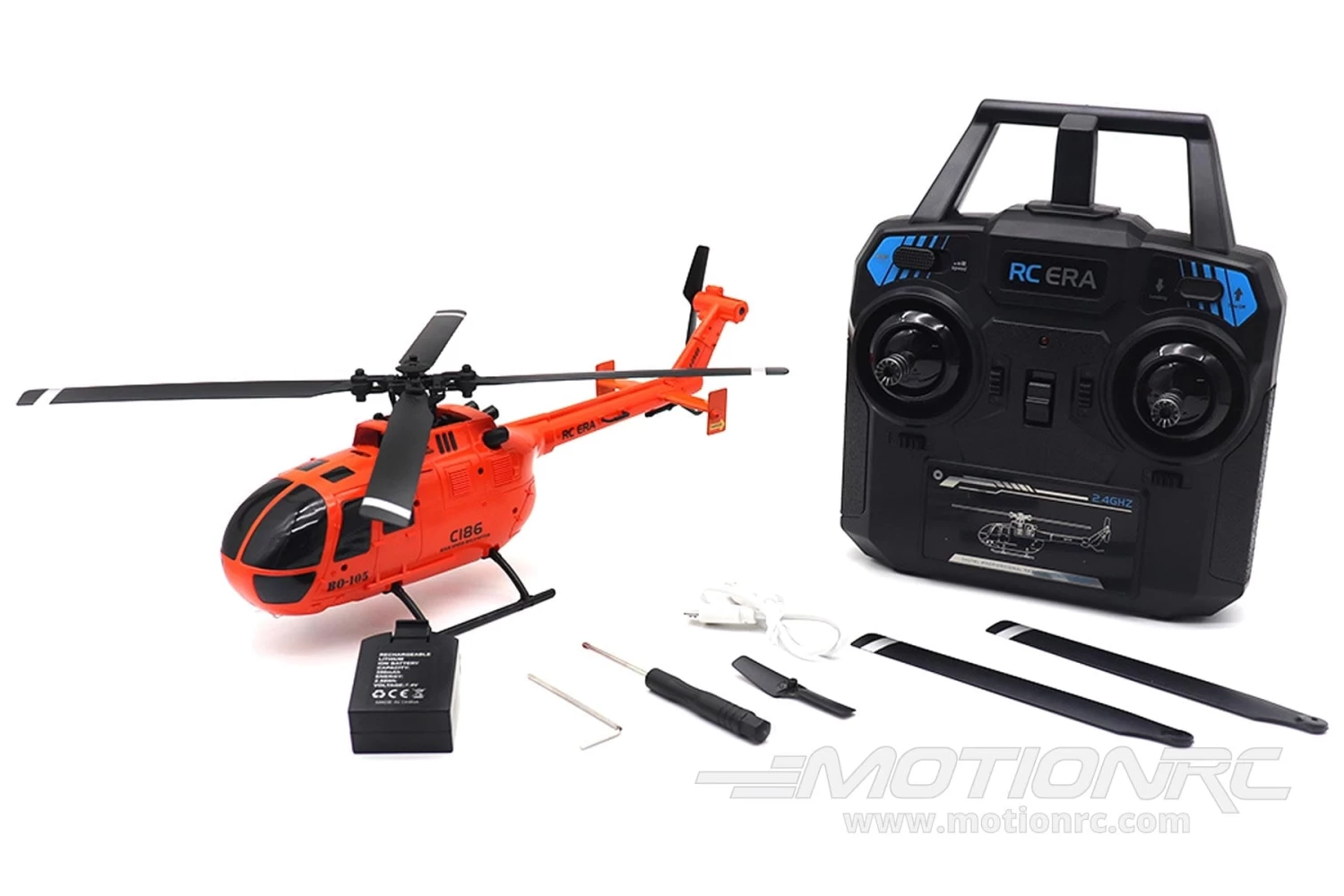 Practice your flying skills in the comfort of your own backyard with the RotorScale BO-105. Perfect for flying in enclosed spaces with minimal wind, the BO-105 is affordable, quiet, gyro-stabilized, easy-to-fly and well supported by Motion RC’s line of spare parts. The BO-105 arrives “RTF” (Ready To Fly), and includes everything you need to begin flying within minutes except four AA batteries for the included radio transmitter/controller. Quickly check the flight battery’s charge level with the press of a button on its built-in LED display.